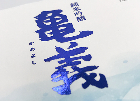 商品の味わい、世界観を感じさせる日本酒ラベル。銀色の紙とエンボス加工で、商品の高級感を際立てた事例です。フルカラー印刷で、商品の味わいや世界観を視覚的に表現しています。